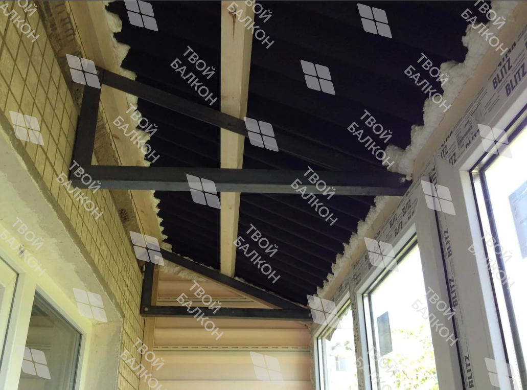 Изготовление крыши на балконе в панельном 5 этажном доме и остекление балкона. Крыша выполнена из металлических конструкций, методом сварки. Обрешетка крыши - дерево. Кровельный материал — металлический профлист. Остекление выполнено алюминиевыми раздвижными окнами. Материал предоставлен фирмой «Балкония».