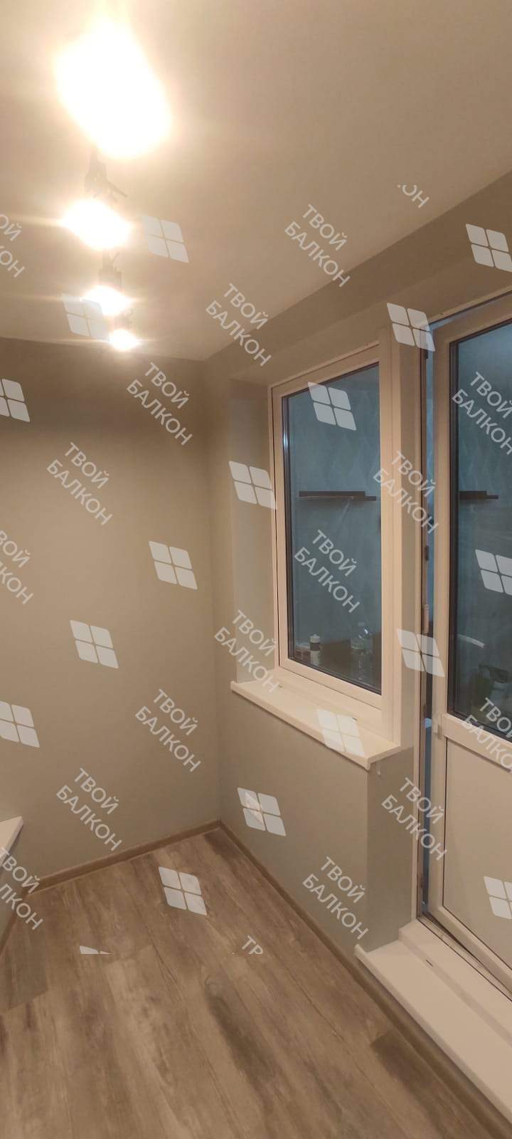 Реализована работы по отделке балкон с утеплением в многоквартирном доме. Сделано остекление балкона и установлен балконный блок. Все окна выполнены из профиля Rehau Grazio 70 с энергосбережением. Сделано утепление. Отделка стен и потолка выполнена из гипокартона с покраской, пол ламинат. Выведено и разведено по балкону электричество. Подключен теплый пол. Установлены  светильники  в бра стиле. Материал предоставлялся компанией согласно пожеланиям заказчика.