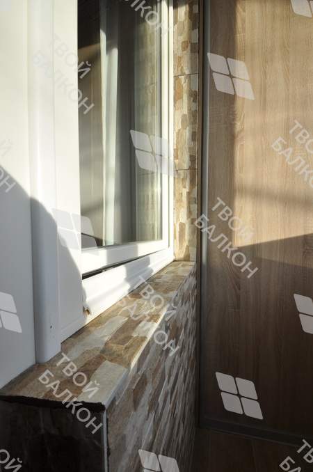 Отделка с утеплением балкона в панельном доме П-30: отделка стен выполнена камнем, отделка потолка - влагостойкий гипсокартон с покраской, пол - керамогранит. Парапет и подоконник выполнены из массива дуба. Выведено и разведено электричество. На место старого балконного блока, установлены: новые окна и балконный блок из сосны 78 мм с двухкамерным стеклопакетом и с энергосбережением. Установлен шкаф из ЛДСП. Материал предоставлялся компанией «Балкония», согласно пожеланиям заказчика.
