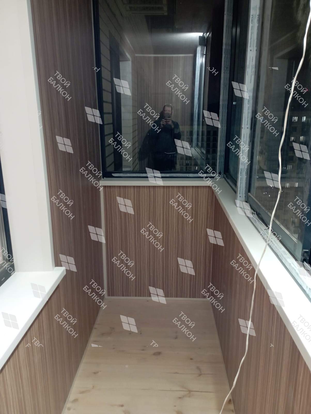 Сделано: отделка стен и потолка выполнена из ПВХ панелей, пол "доска пола" сорт В. Материал предоставлялся компанией «Балкония» согласно пожеланиям заказчика.