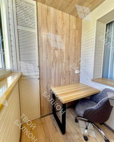 Дизайнерская отделка с утеплением лоджии в доме серии П-111М. Сделано эркерное остекление ПВХ Rehau, обшивка стен ламинатом липа, потолока ламинатом, подключен теплый пол с отделкой ламинат, утепление. Проведено электричество, монтаж светильников. Встроенная, навесная и откидная мебель по индивидуальным размерам. Материал предоставлялся компаний Балкония согласно пожеланиям заказчика.